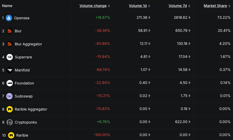 OpenSea has remained the dominant NFT marketplace despite the broader downturn, accounting for more than 73% of all activity across the sector at publishing time, with competition from rivals such as Blur, according to DefiLlama.