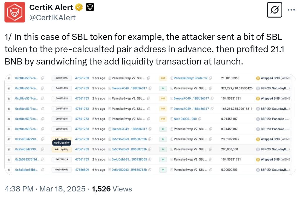 “In this case of SBL token, for example, the attacker sent a bit of SBL token to the pre-calculated pair address in advance, then profited 21.1 BNB by sandwiching the add liquidity transaction at launch,” CertiK said.