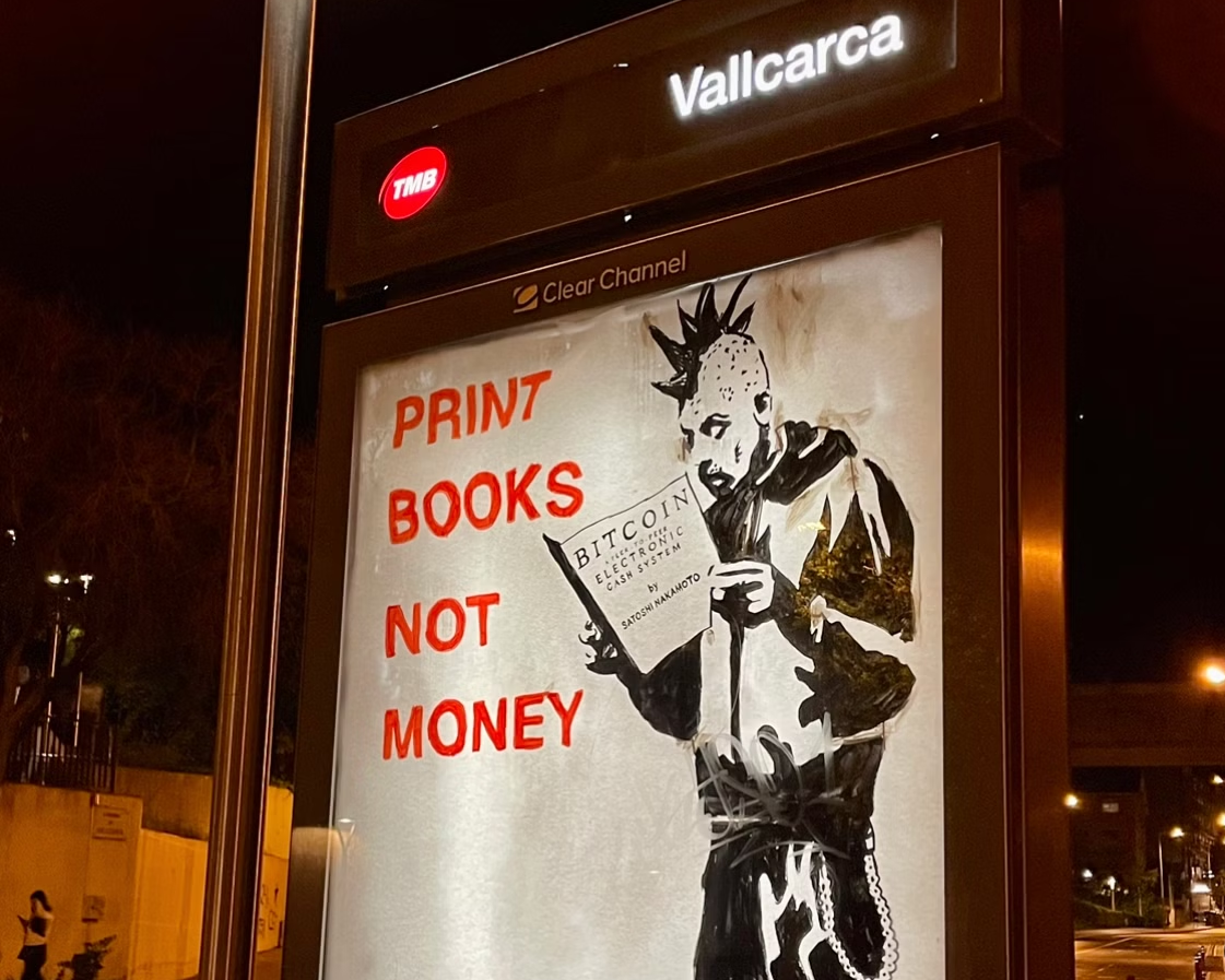 “Print Books Not Money” poster at a bus interchange in Barcelona. Source: Street Cy₿er