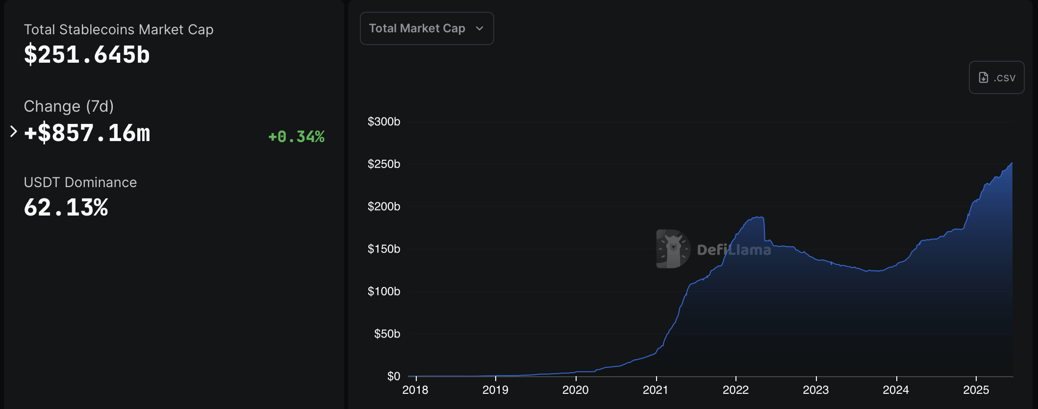 According to DefiLlama, the two largest stablecoins in the crypto space are pegged to the dollar — Tether’s USDt (USDT) and Circle’s USDC (USDC). Together, these tokens make up $217.5 billion or 86.4% of the total stablecoin market cap of $251.7 billion.