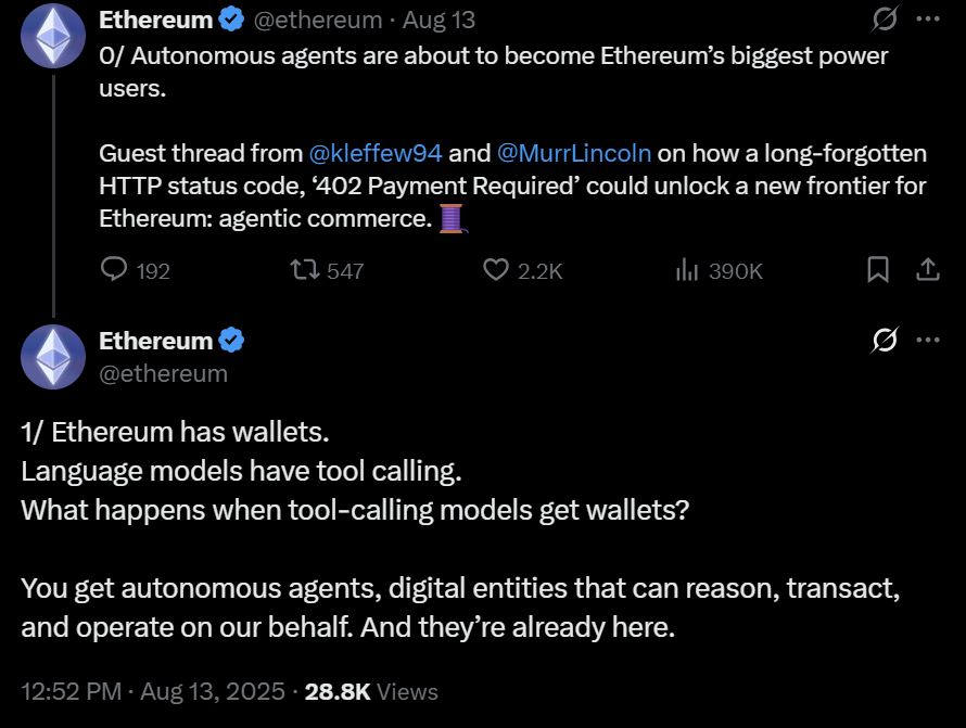 In August, the foundation pointed to the dormant HTTP 402 status code — which denotes “payment required” — and noted that, when paired with Ethereum Improvement Proposal (EIP) 3009, it could enable AI agents to execute stablecoin transfers automatically.