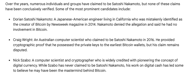 On the other hand, Gemini/Bard offered three detailed examples of individuals who have tried to claim the identity of Satoshi Nakamoto.