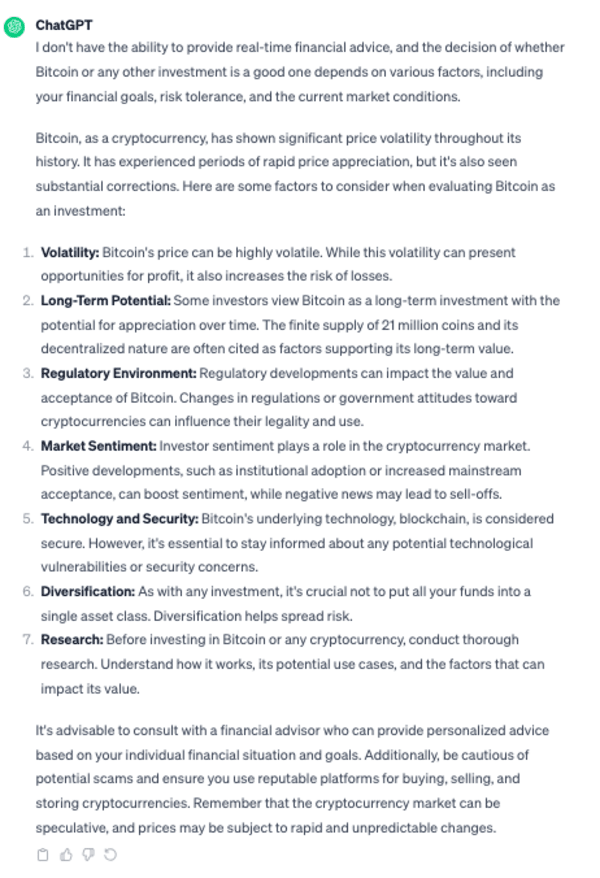 We also asked both models to give us some investment advice, selecting the industry’s tried and tested Bitcoin (BTC) as our cryptocurrency of choice. We asked: “Is Bitcoin a good investment?”