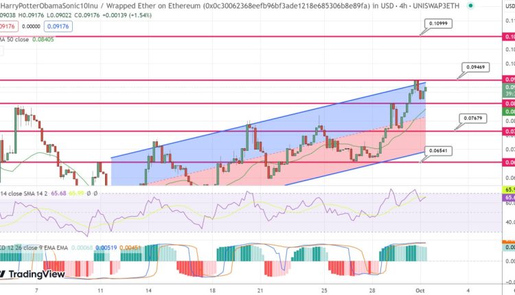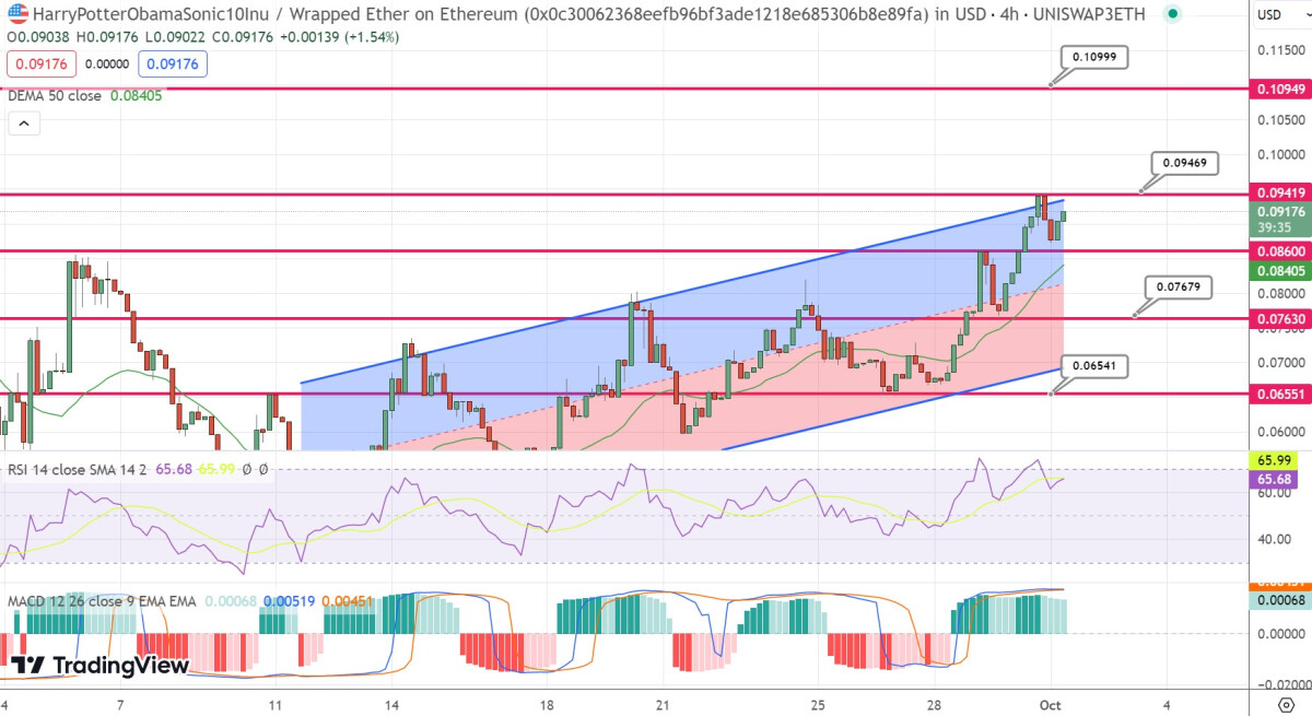 On October 01, the trading price for HarryPotterObamaSonic10Inu (BSC) stood at 0.09152, with a trading volume over the past 24 hours clocking in at $2.70.