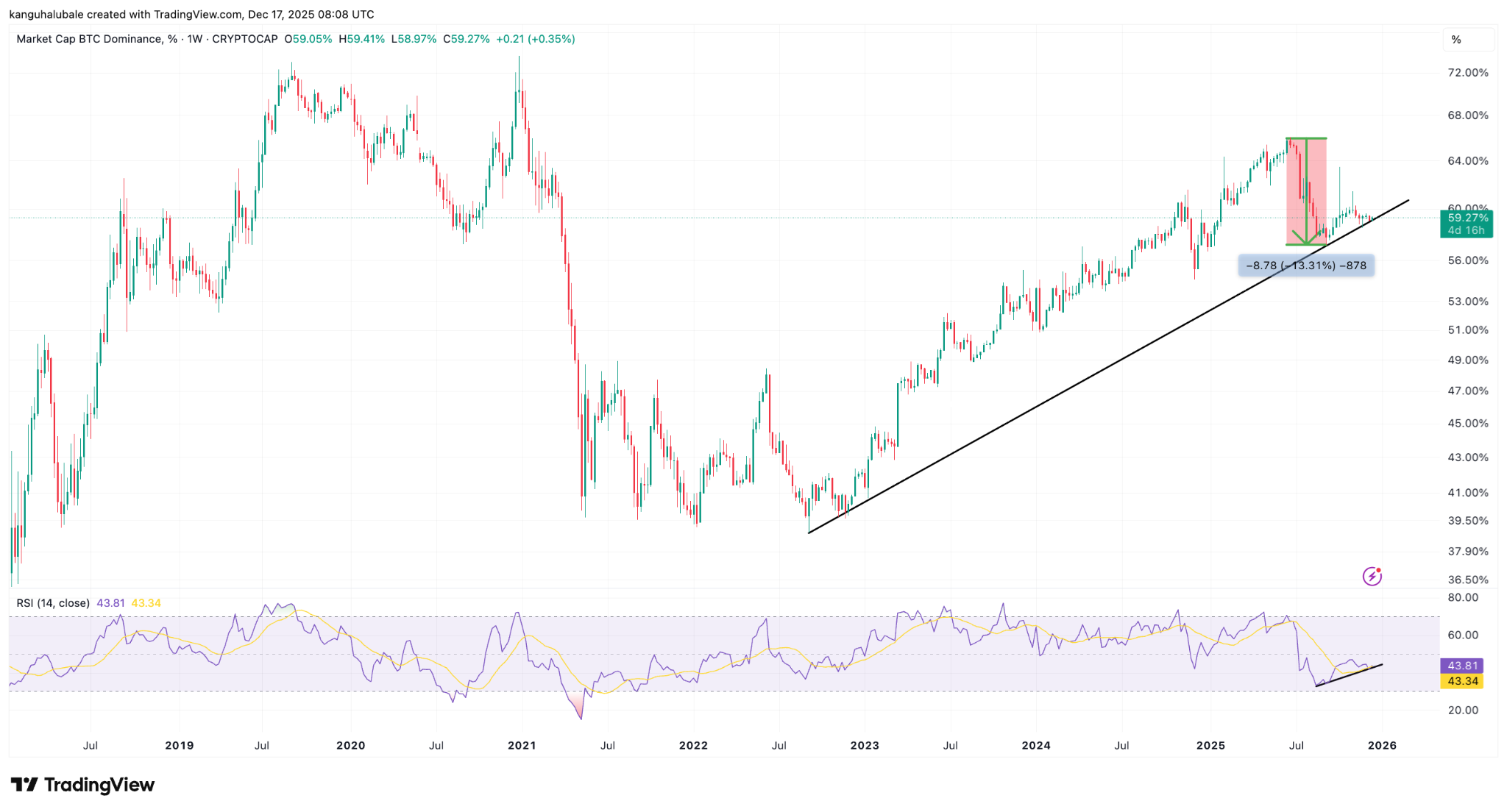 Rising BTC dominance and a low altcoin season index show no signs of reversal.