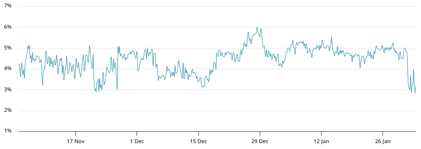 Traders grew increasingly concerned after spot Bitcoin exchange-traded funds (ETFs) recorded $3.2 billion in net outflows since Jan. 16. Even so, the figure represents less than 3% of the products’ assets under management. Strategy (MSTR US) also fell victim to unfounded speculation after its shares traded below net asset value, fueling fears that the company would sell some of its Bitcoin.