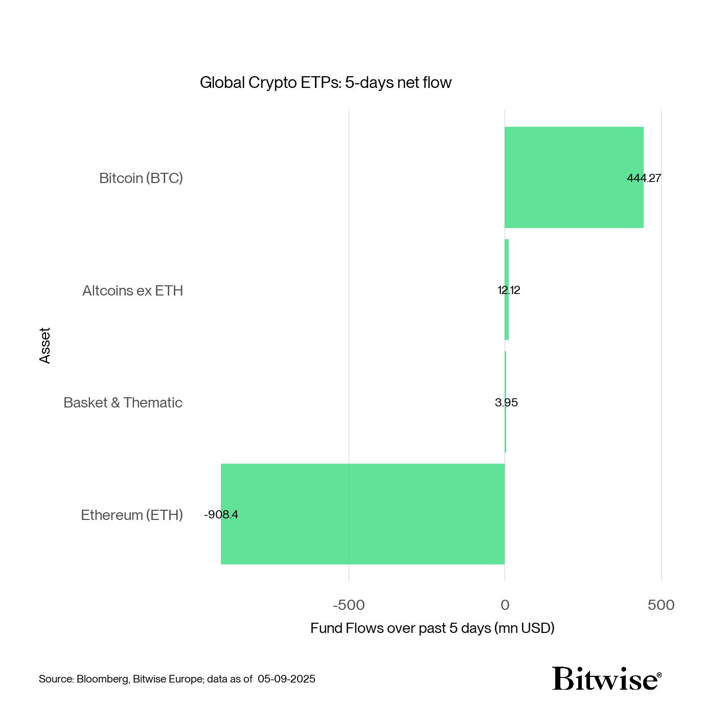 Figures uploaded to X Monday by Andre Dragosch, European head of research at crypto asset manager Bitwise, show Bitcoin ETPs added $444 million in the five days through Sept. 5.