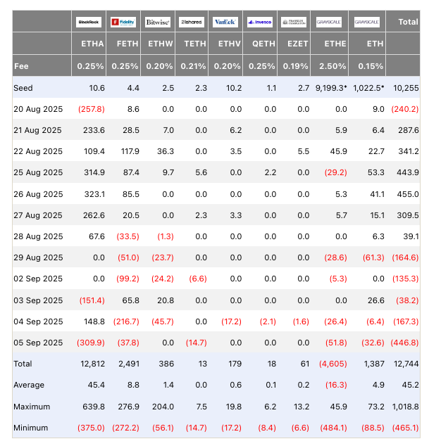 Data from UK investment firm Farside Investors captured four straight days of net outflows for spot Ether ETFs, totaling more than $750 million.