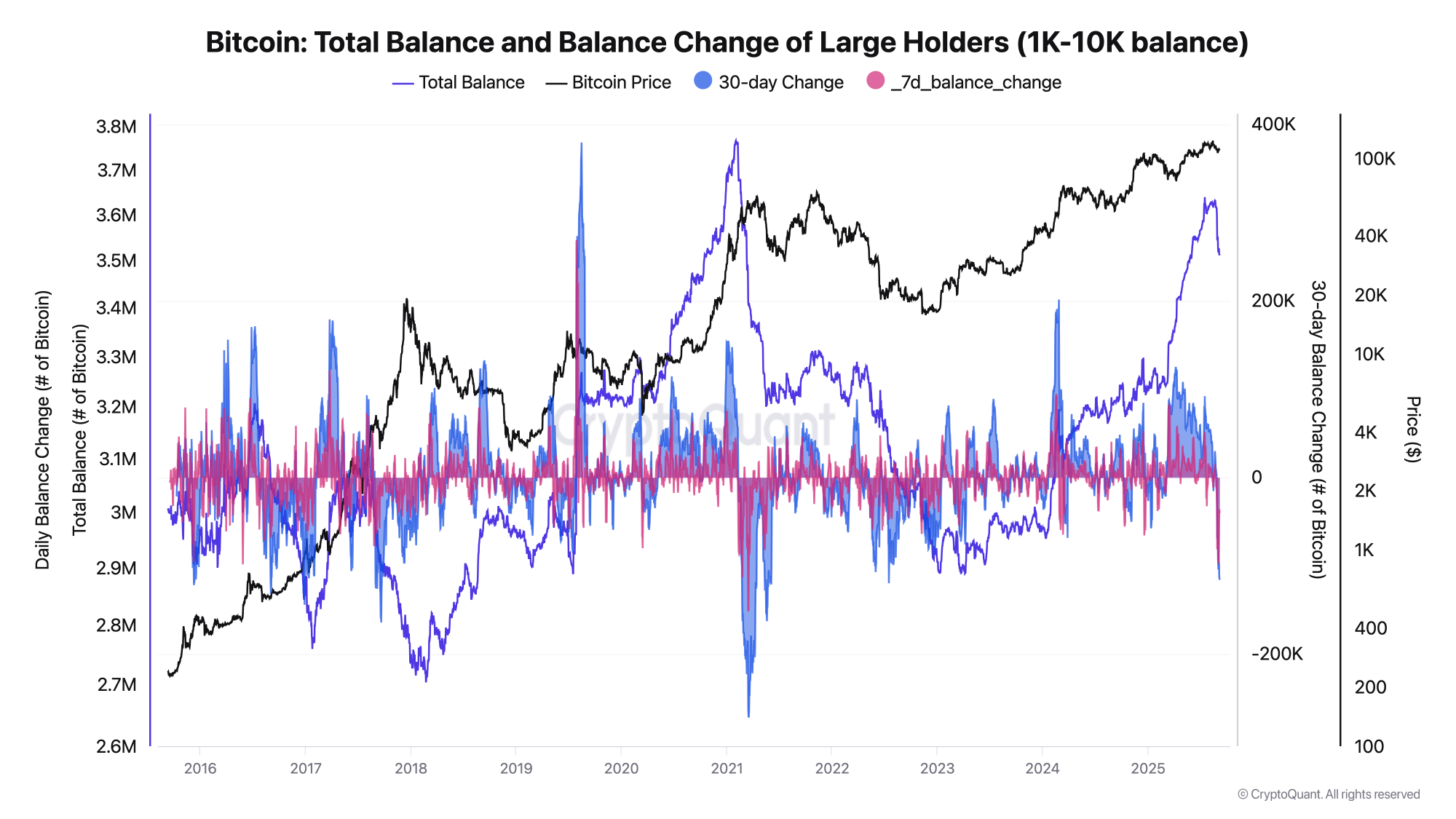 When it comes to the largest Bitcoin investors, the trend is giving onchain analytics platform CryptoQuant cause for concern.