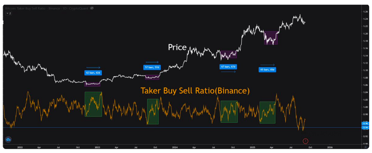 “Bullish divergence of the Taker Buy/Sell Ratio has repeatedly occurred during the price bottom or sideways consolidation phases of this Bitcoin bull cycle, which has been ongoing since 2023,” contributor Mignolet summarized in another “Quicktake” post.