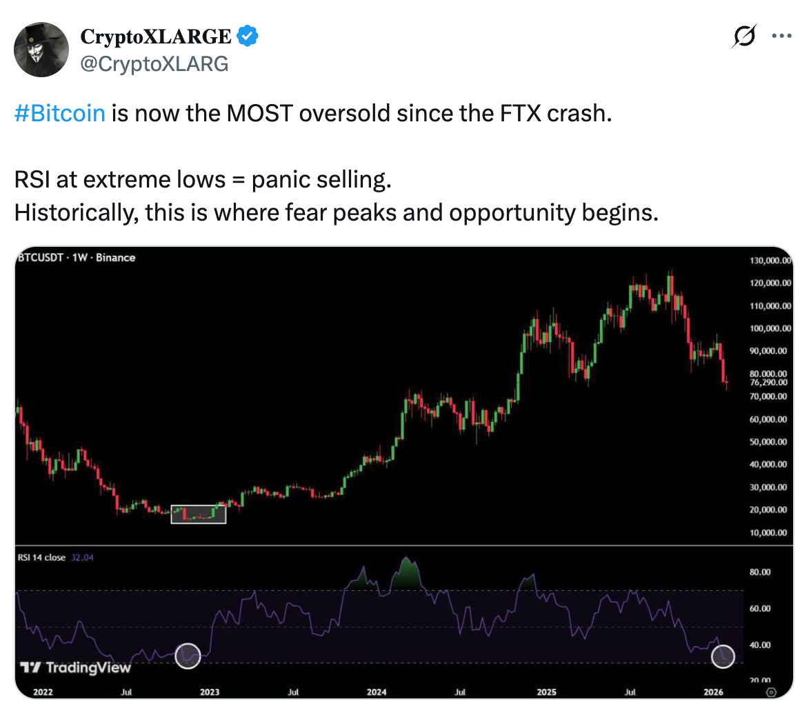 “Bitcoin is now the MOST oversold since the FTX crash,” CryptoXLARGE said in an X post on Wednesday, adding that it reflects panic selling among investors.