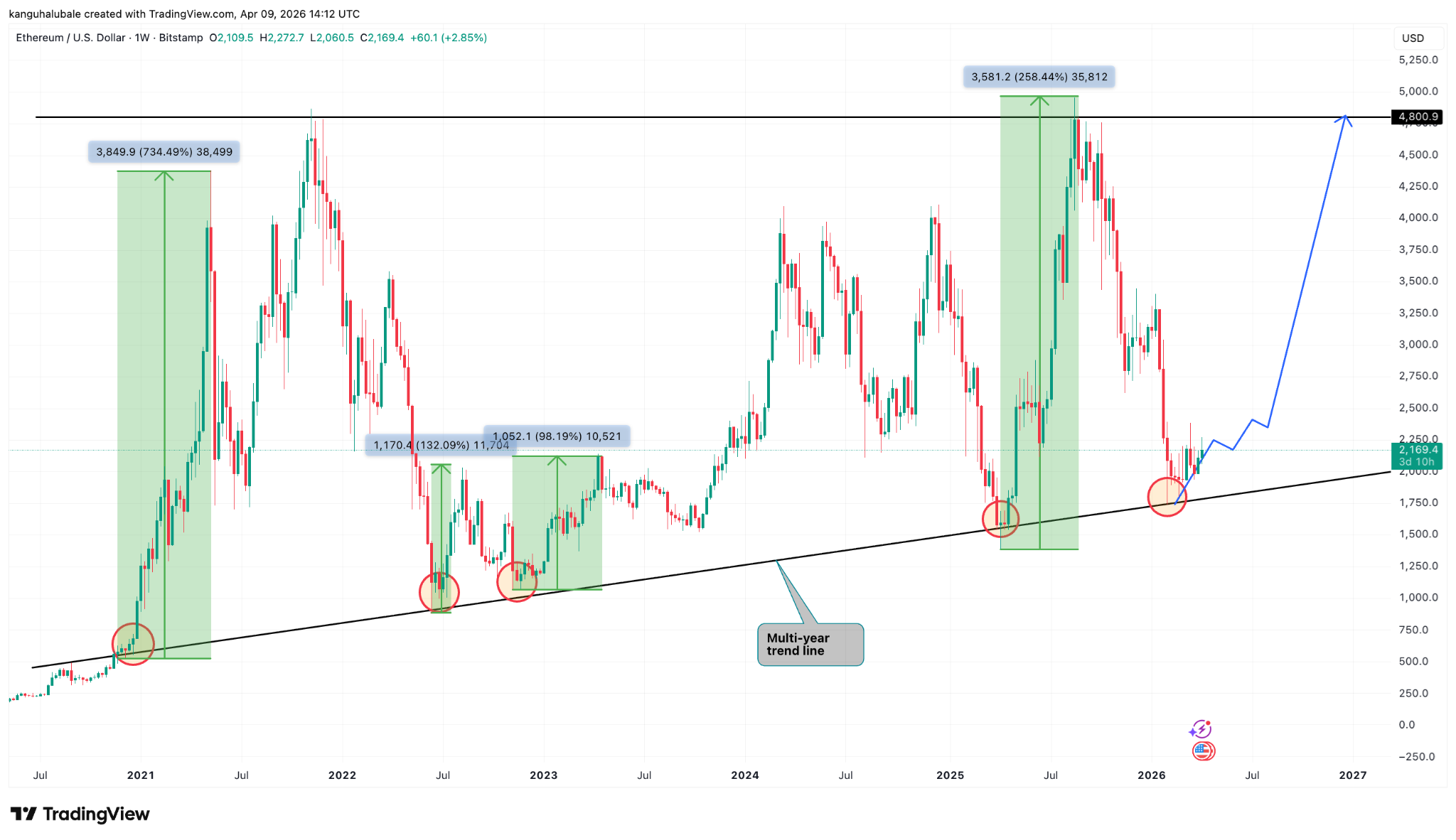 ETH price bounced off a multi-year trendline that has marked previous macro lows.