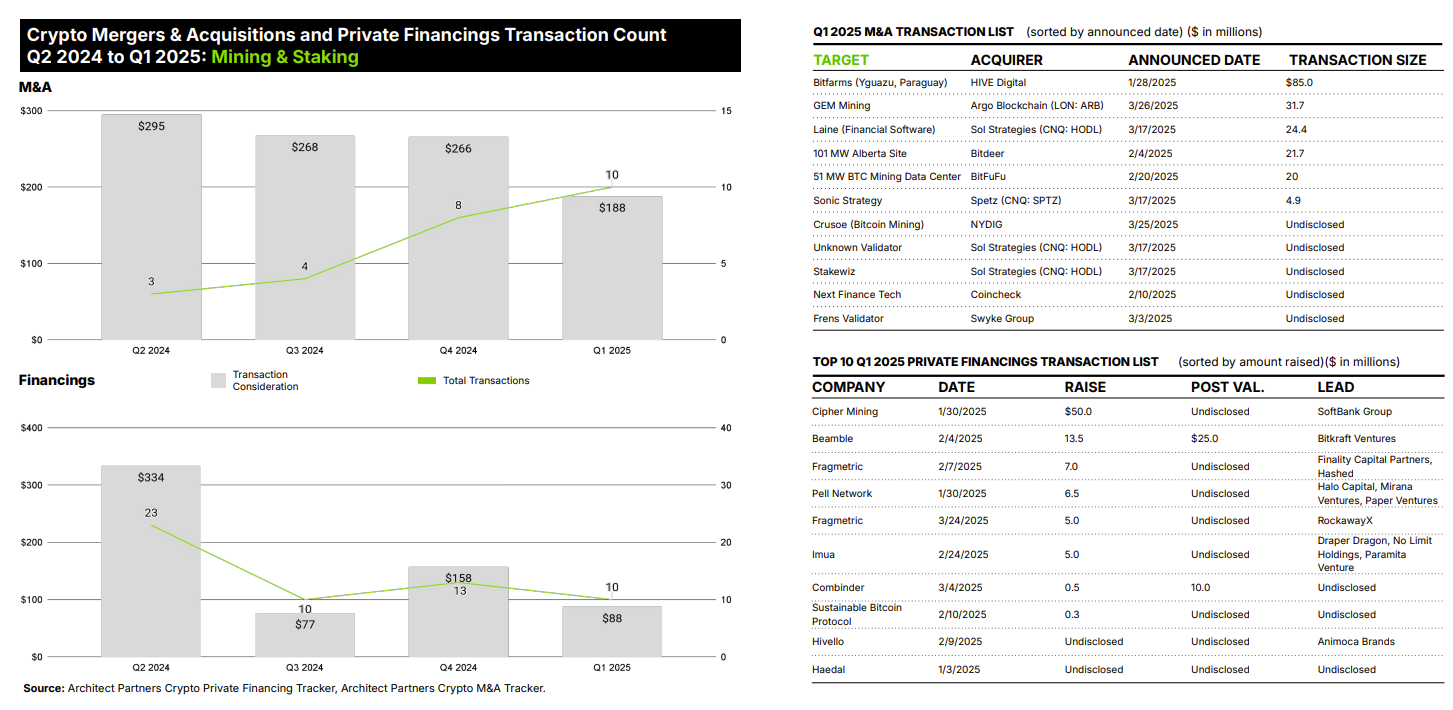Among mining and staking firms, there were 10 transactions in the first quarter of 2025 valued at $188 million. In the quarter before that, eight transactions valued at $266 million were completed.