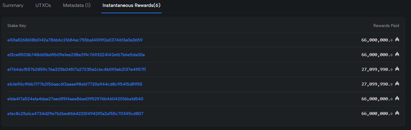A secondary, “Move Instantneous Rewards” transaction dated Oct. 24, 2021, shows a transfer of over 318 million ADA tokens, which enabled the funds to flow from reserve pools into staking or treasury allocations.