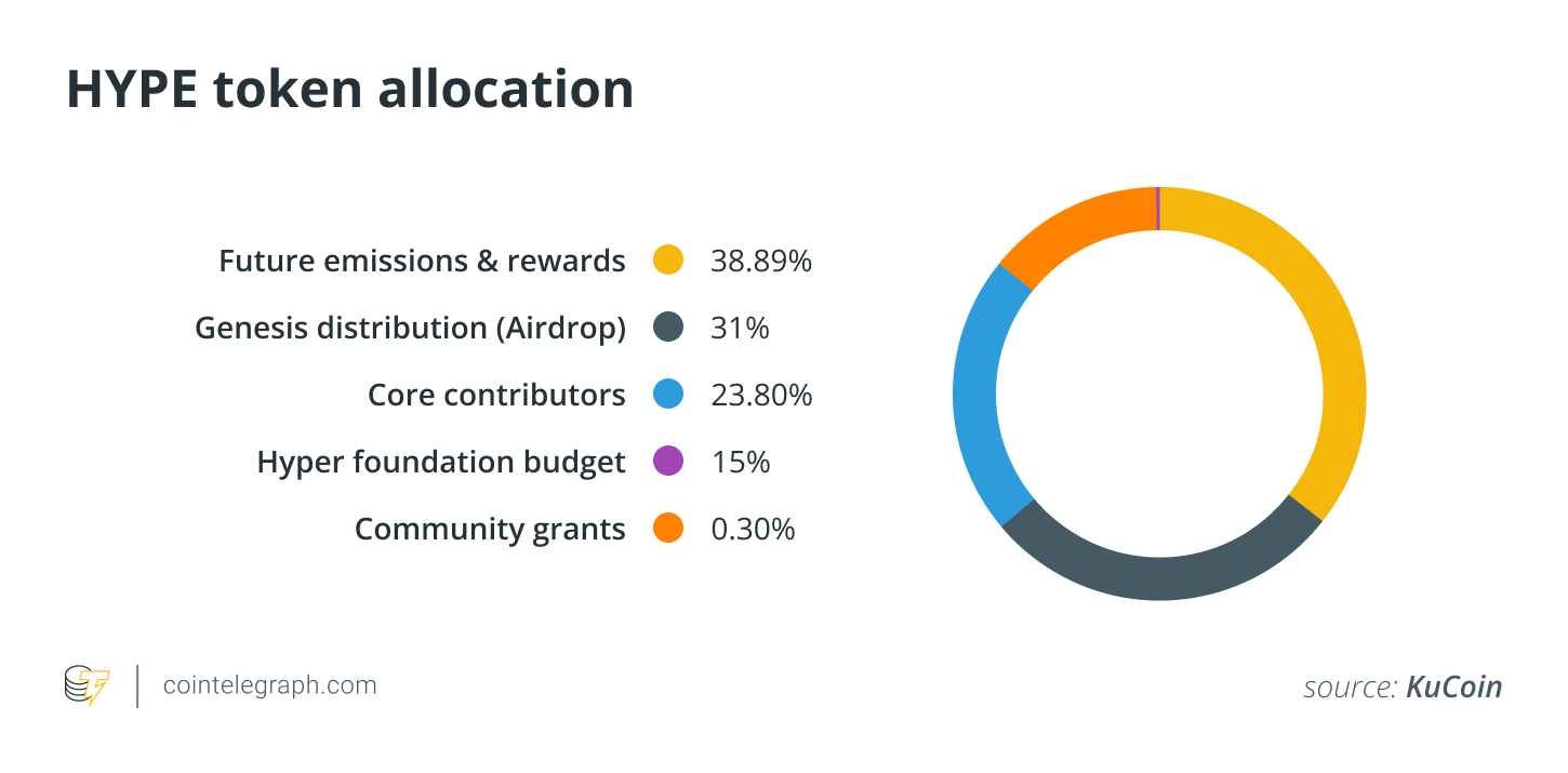 On Nov. 29, 2024, the project launched the HYPE genesis airdrop, distributing about 310 million tokens to early participants. The event coincided with the token’s trading debut, reinforcing a community-first approach. Hyperliquid (HYPE) is used for staking in HyperBFT and for gas payments onchain.