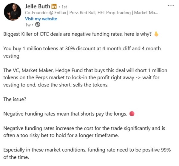 Venture capitalists, funds and market makers can often secure allocations at roughly a 30% discount with three- to four-month vesting, then hedge by shorting the same amount on perpetual futures markets, according to Jelle Buth, co-founder of market maker Enflux.