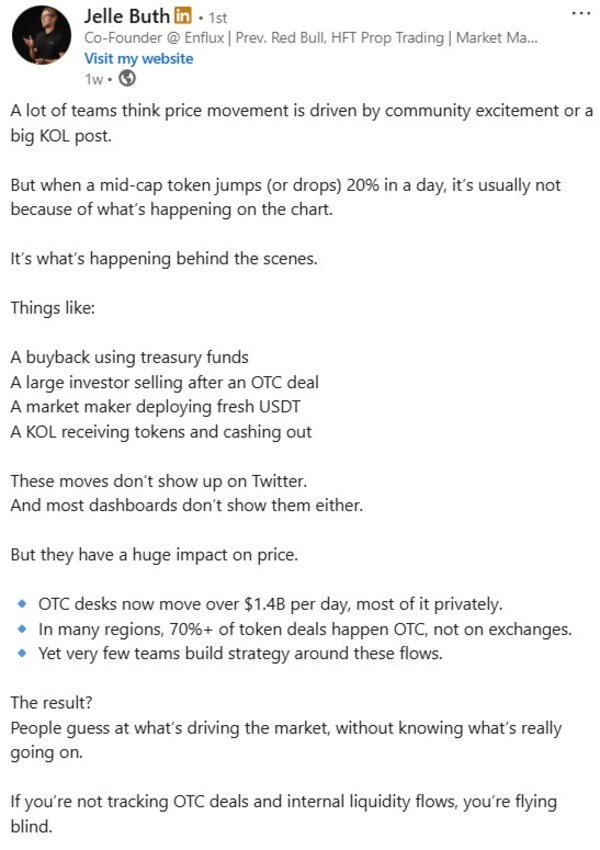 “If you’re trading a token and don’t know there’s a stack of paper out there that can be dumped at a discount, you’re just trading blind. Retail ends up absorbing the sell pressure, while insiders lock in risk-free trades. That asymmetry is brutal.”