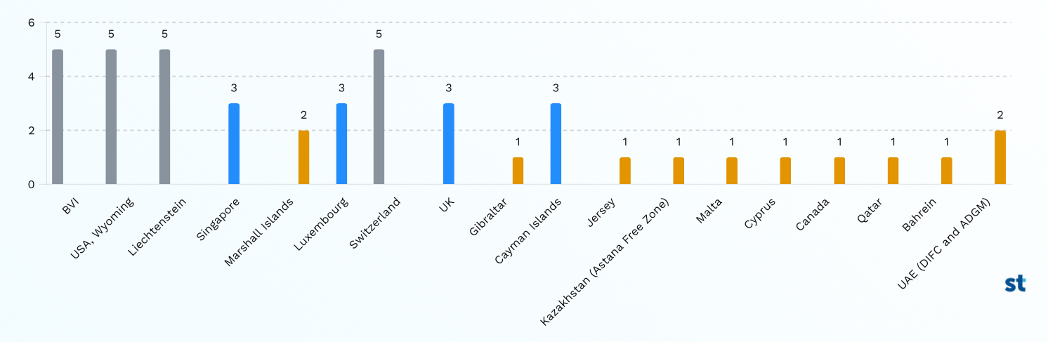 Additionally, Stobox found that the top five jurisdictions for running a tokenization deal are the British Virgin Islands, the US State of Wyoming, Liechtenstein, Singapore and the Marshall Islands.