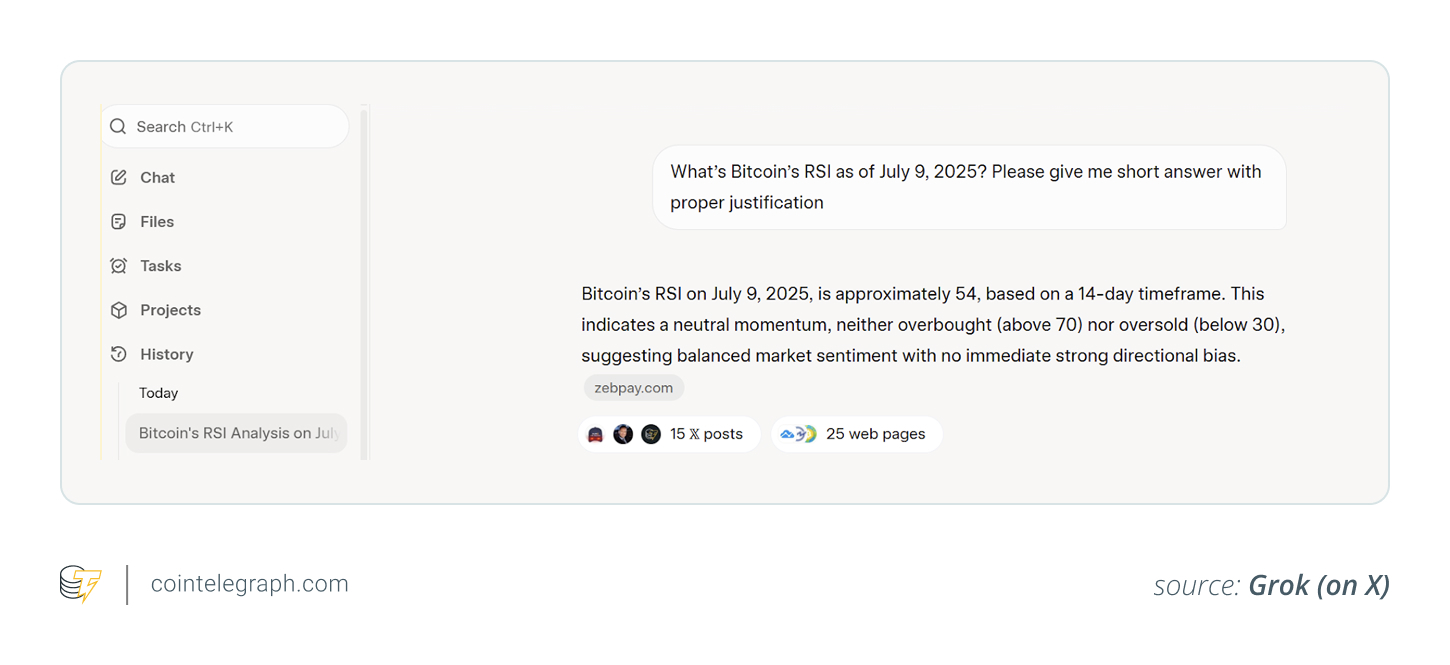 According to Grok, Bitcoin’s RSI is 54 on July 9, 2025, using a 14-day timeframe, indicating neutral momentum (see image below).