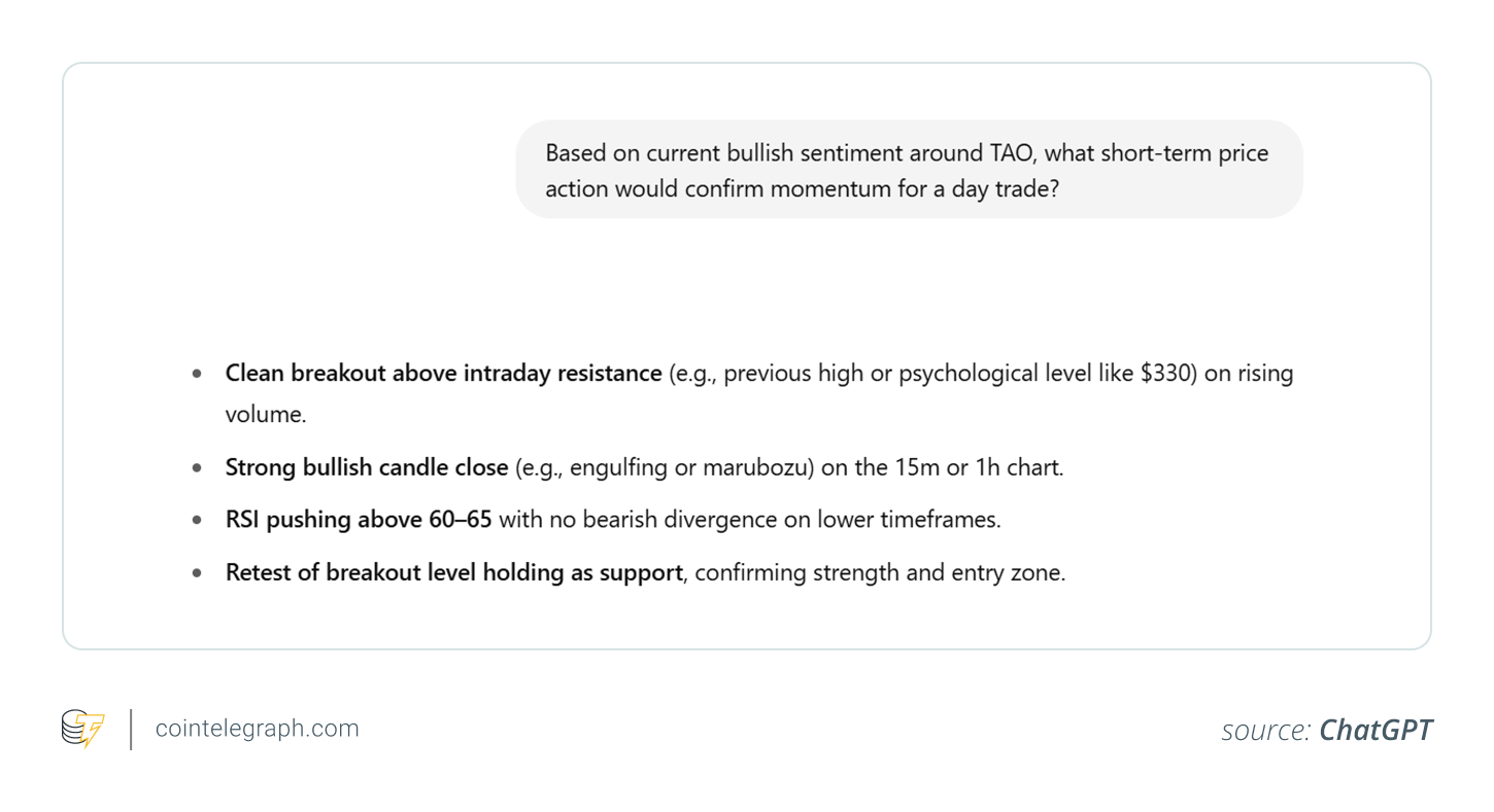 Use case: The Grok output highlights bullish sentiment driven by TAO’s user base, integrations and long-term growth potential.