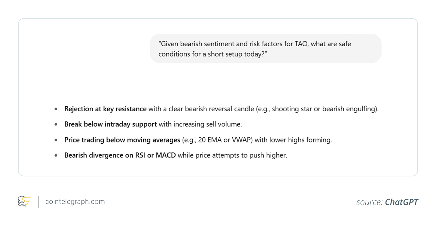 “Given bearish sentiment and risk factors for TAO, what are safe conditions for a short setup today?”