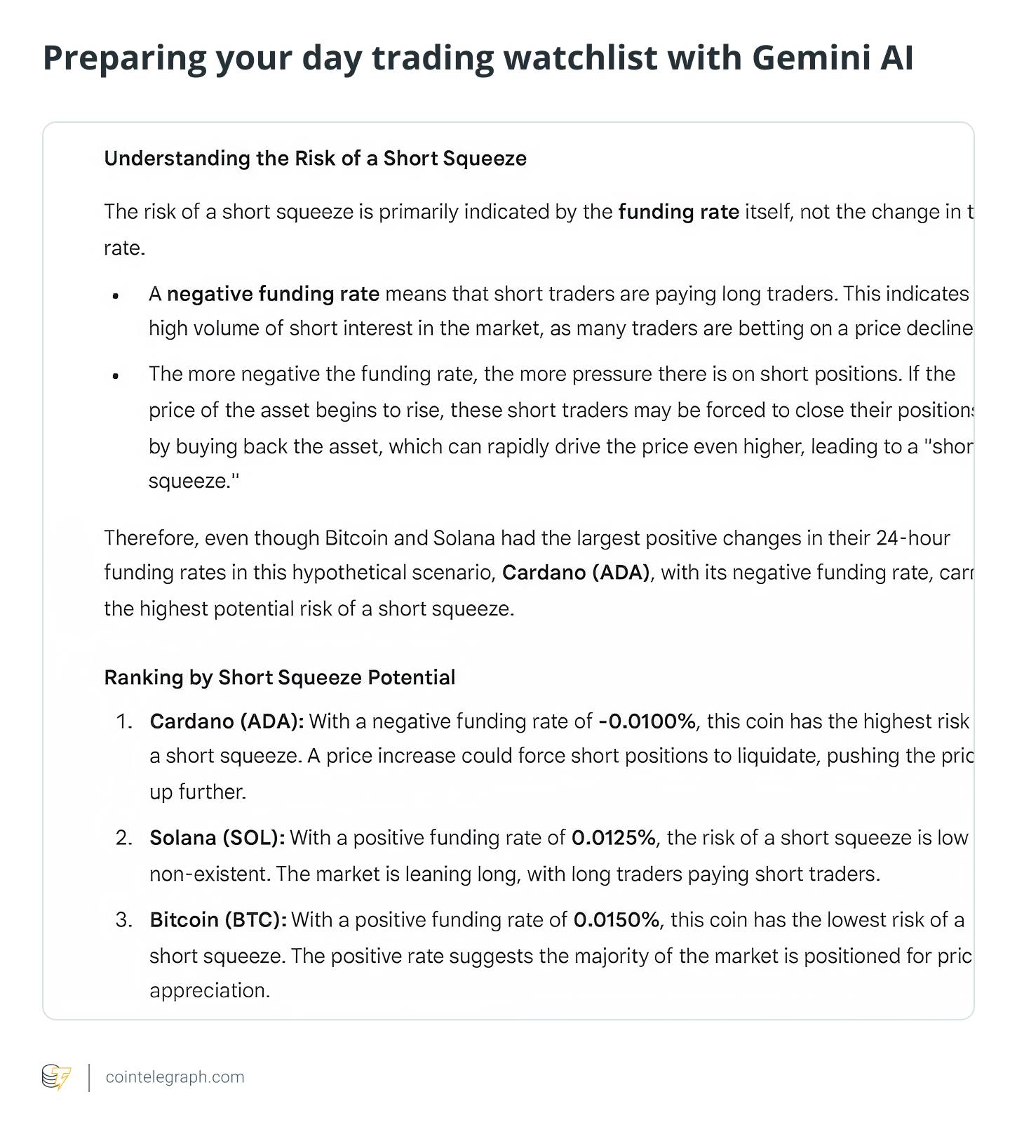 Say your watchlist includes Bitcoin (BTC), Cardano (ADA) and Solana (SOL). Instead of scanning 50 tokens, you ask Gemini to highlight which ones had the biggest market swings or the highest percentage changes in the past 24 hours (pulled from your own data feed or an external data platform).