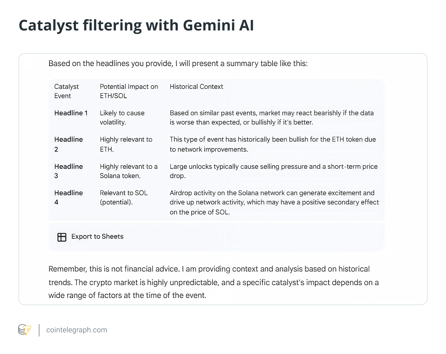 Catalysts drive intraday moves, Consumer Price Index reports, US Federal Reserve minutes, token unlocks, tech upgrades or even airdrop rumors. But there’s more noise than signal. Instead of manually scrolling through X or Discord, paste in the headlines and ask Gemini AI.