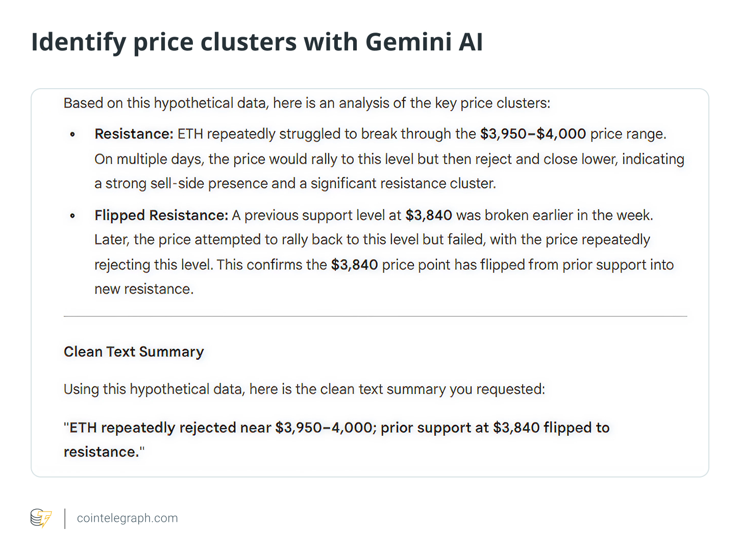 Instead of eyeballing, you get a clean text summary: “ETH repeatedly rejected near $3,950-$40,000; prior support at $3,840 flipped resistance.”