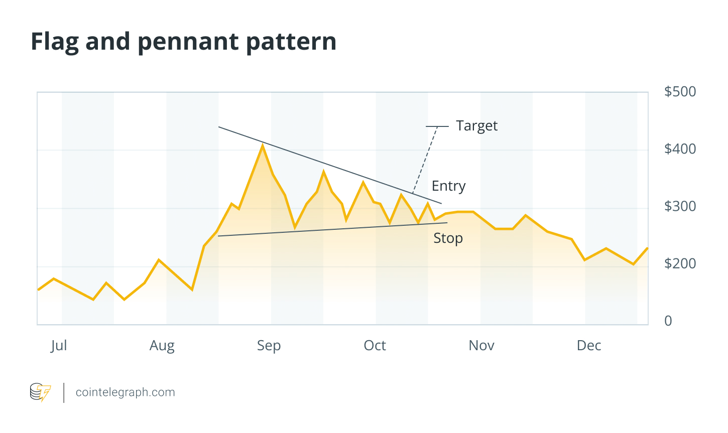 • How to read: A steep “pole” followed by a short consolidation suggests that the trend is likely to resume. These patterns are bullish in uptrends and bearish in downtrends. Traders often enter on a pullback within the flag or pennant to improve risk-reward.