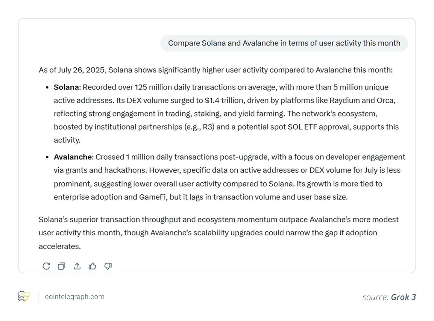 Grok’s response, as shown in the image below, provides a clear, data-backed comparison, highlighting Solana’s dominance in user activity, transaction volume and decentralized exchange engagement. It contrasts Avalanche’s growth via developer activity but notes weaker metrics. The response is concise, informative and balanced, with strong contextual framing around ecosystem drivers and institutional influence.