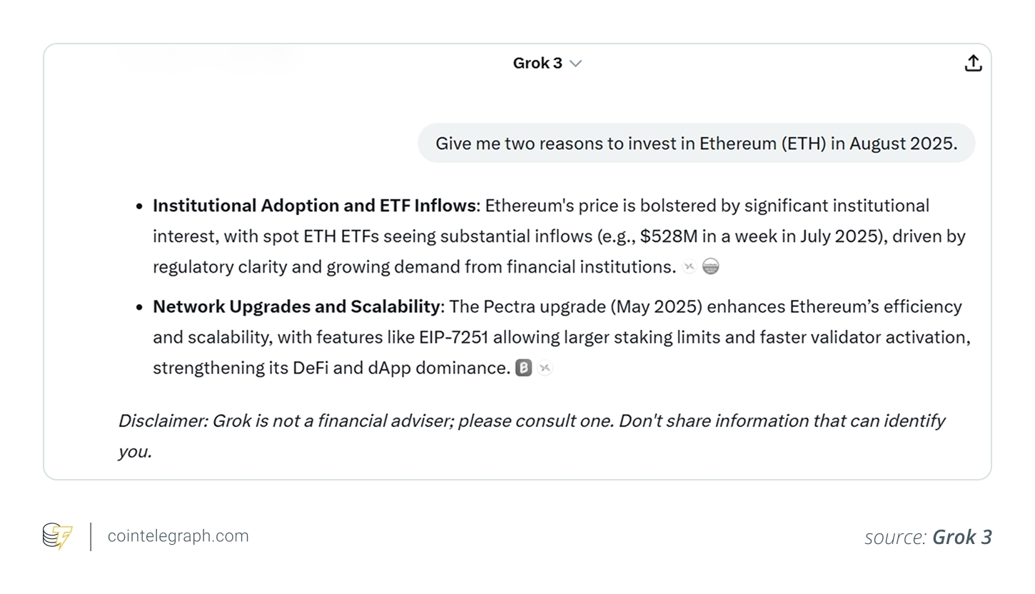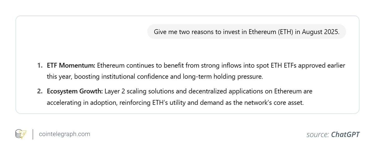 As observed above, ChatGPT’s response provides a broader and more accessible rationale. It focuses on exchange-traded fund (ETF) momentum and ecosystem growth through layer-2 solutions and decentralized applications, concepts that are easier to grasp for newer investors. This response takes a big-picture view and highlights Ether’s (ETH) expanding utility and adoption. However, it lacks the specificity and numerical support found in the Grok response, which may make it feel less grounded or convincing for those seeking hard data or detailed developments.