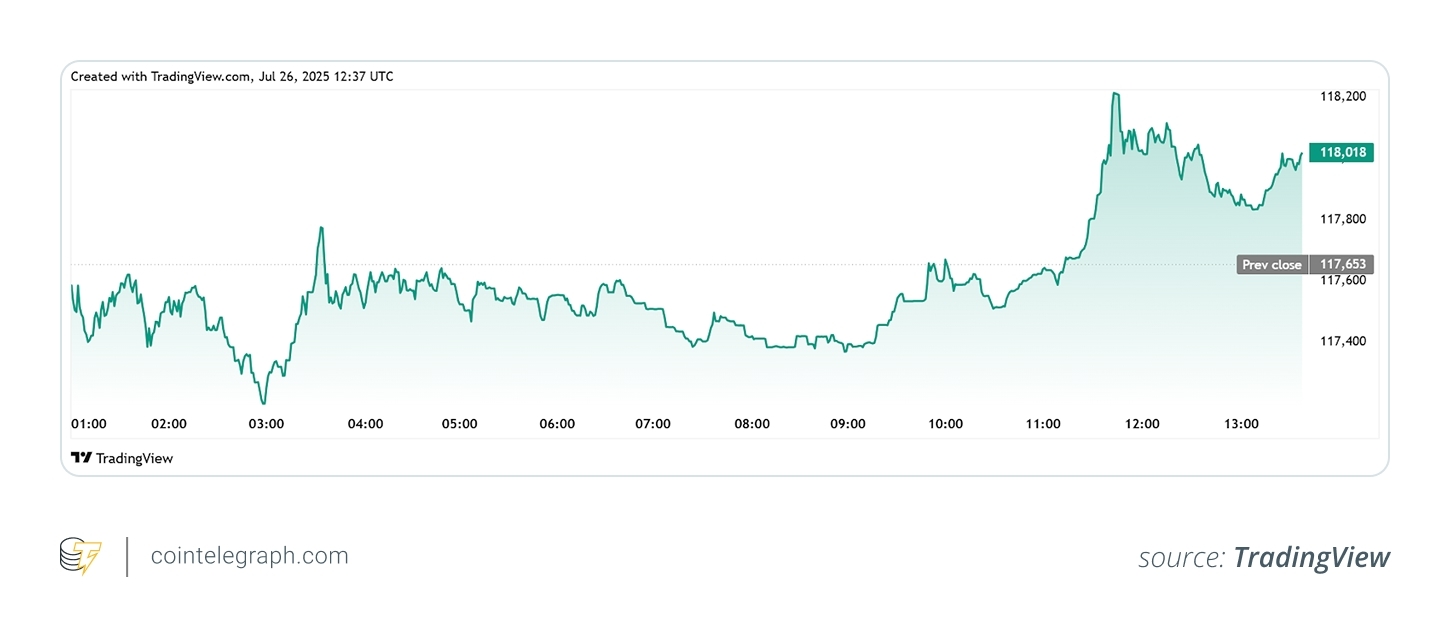 Prompt: Analyze this intraday price chart of BTC/USD from July 26, 2025. Identify any visible trend shifts or breakout levels. Does the late-session surge suggest bullish momentum, or could it be a short squeeze or reaction to external news? Offer a possible short-term outlook.