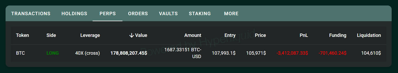 He still has the 40x leveraged long position open in a perpetual contract, according to Hypurrscan. The long bet was opened when Bitcoin was at $107,993 and is currently at an unrealized loss of $3.4 million.