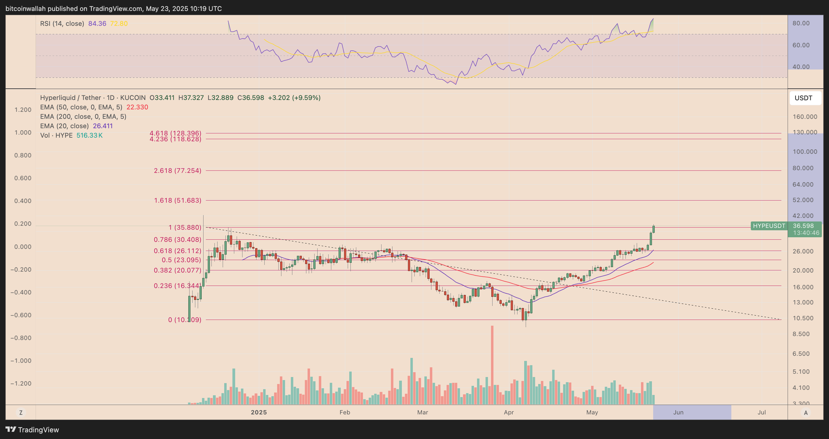 On May 23, HYPE broke above its 1.0 Fibonacci retracement level (~$35.88), echoing the early stages of SOL’s explosive run in 2021.