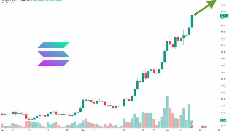 This puts SOL at $49.56, marking a 28% gain in a week and a 121% increase in the last 30 days, while the altcoin has also increased by nearly 400% since January.