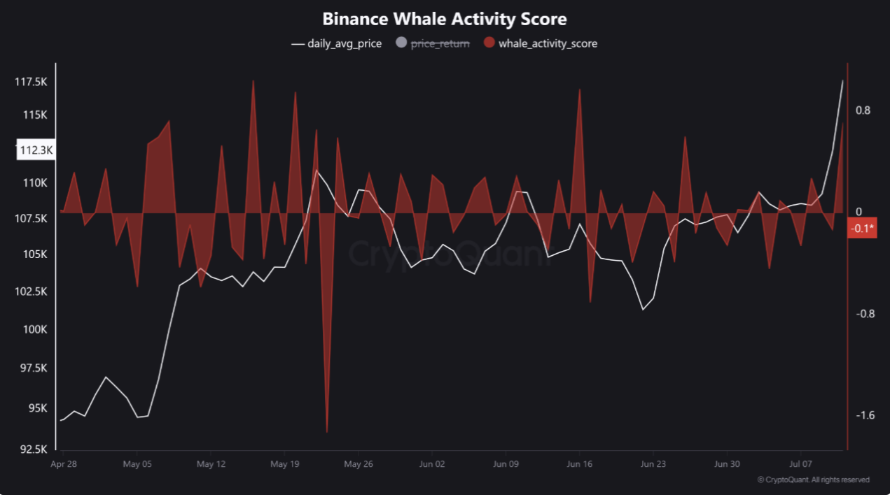 According to the firm, the Binance Whale Activity Score has seen a sharp rise following Bitcoin’s all-time highs of $122,000.