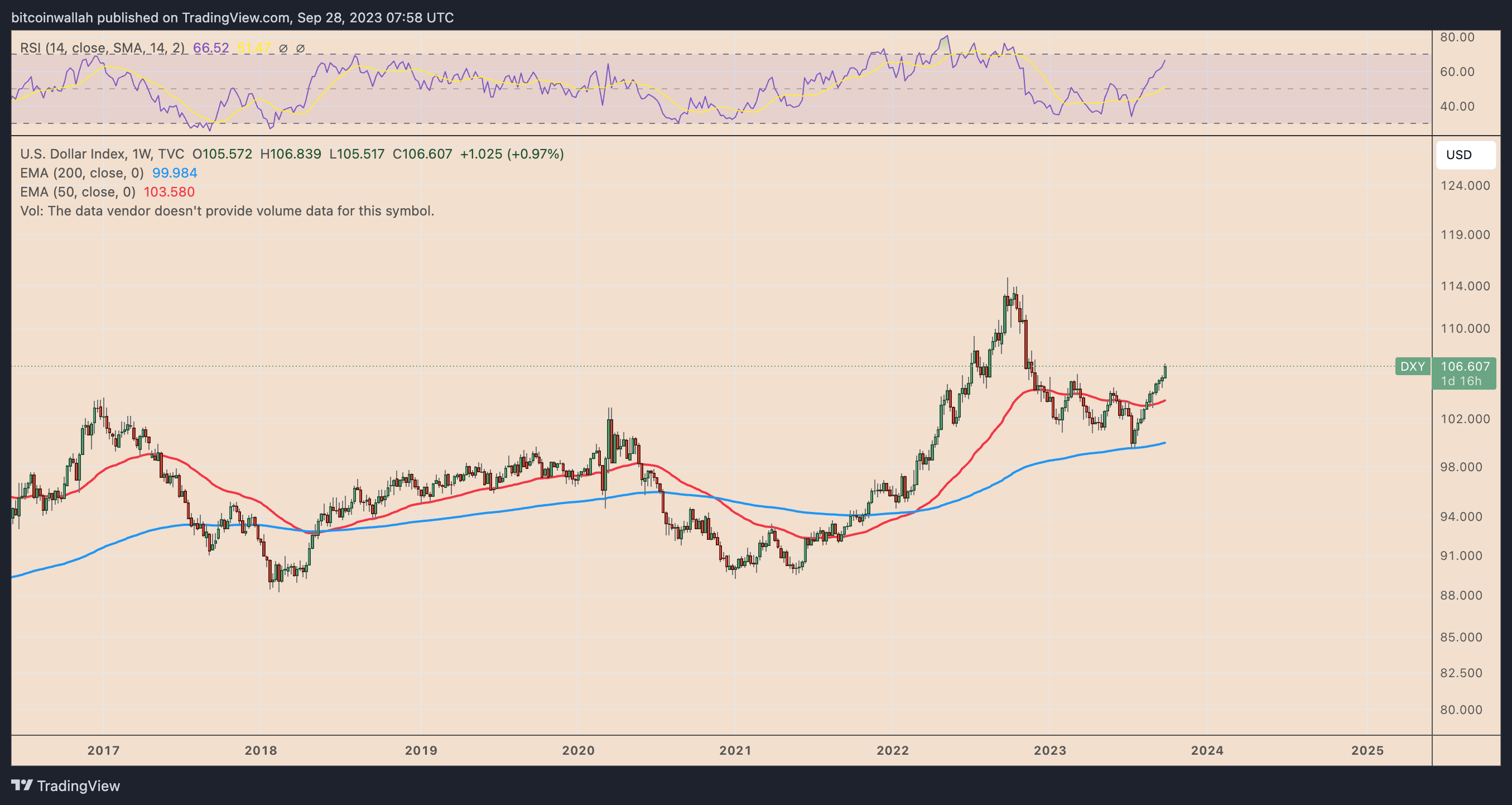 Meanwhile, the U.S. dollar strength index (DXY), which measures the greenback’s strength against a pool of top foreign currencies, has reached its highest level since November 2022.