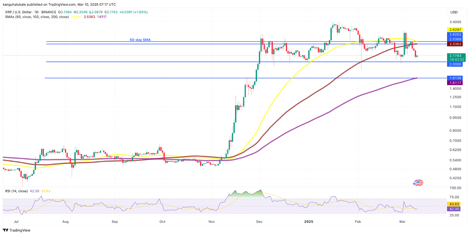 Today’s drop in XRP price is part of a correction that began on March 3 that saw the relative strength index (RSI) fall sharply following XRP’s drop from $3.00.