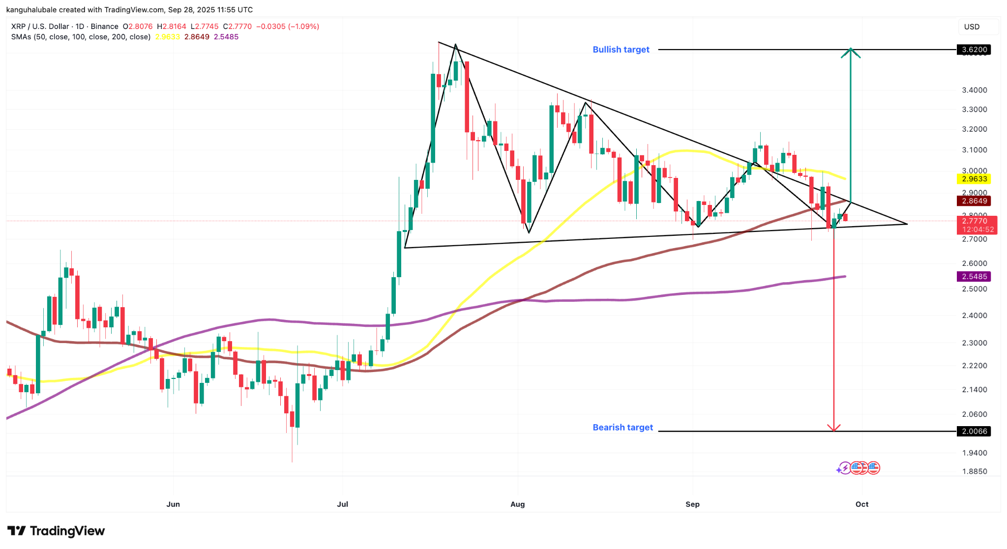 XRP (XRP) traded at the monthly open around $2.77 after dropping 14% over the last two weeks. Holding this level sparks hopes that a recovery could be in the cards going into October.