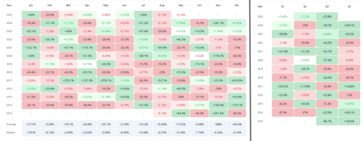 However, November is the best month, making the period between October and December the best quarter for XRP price rallies. It is the only three-month period with average gains of 51%, according to data from Cryptorank.