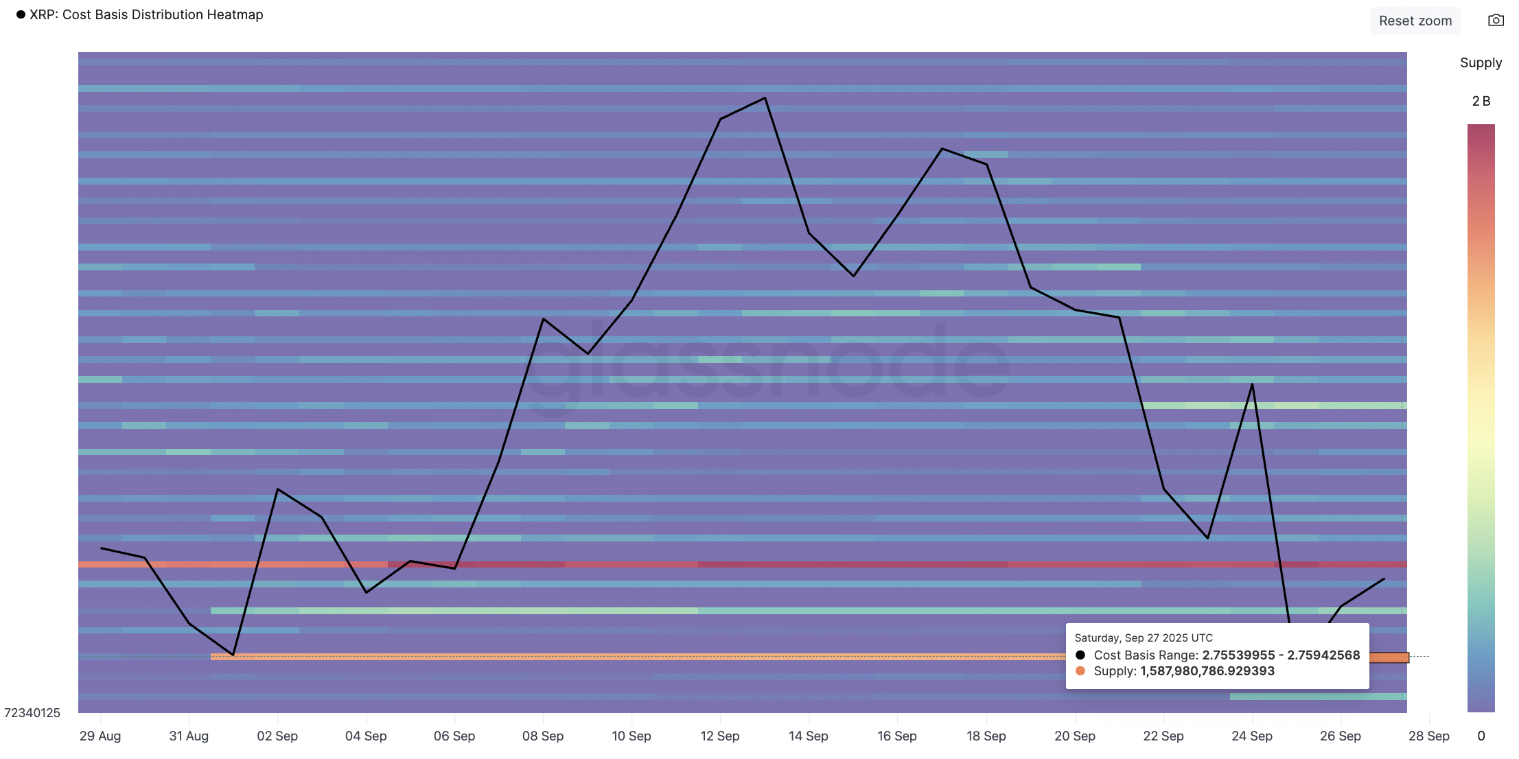 The Glassnode distribution heatmap shows that a large cluster of demand sits between $2.75, where nearly 1.58 billion XRP were acquired, reinforcing the importance of this level.