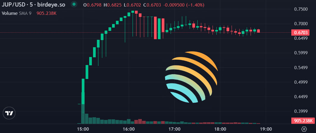 On decentralized exchanges, the Jupiter price quickly pumped around 70% from around $0.41.