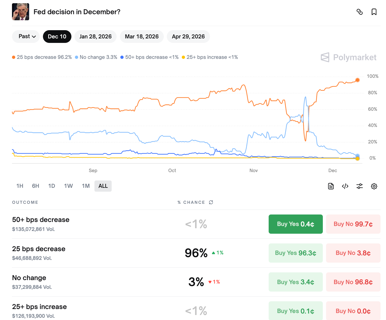 The odds of a 25 bps cut on Wednesday now stand at 96%, according to Polymarket