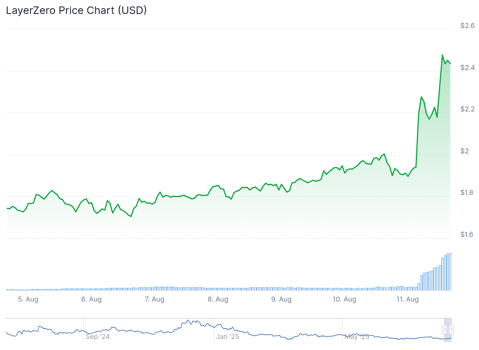 LayerZero’s token has gained over 23% in the past 24 hours to trade at $2.44, making it one of the biggest gainers in the crypto market in the past day, per CoinGecko.
