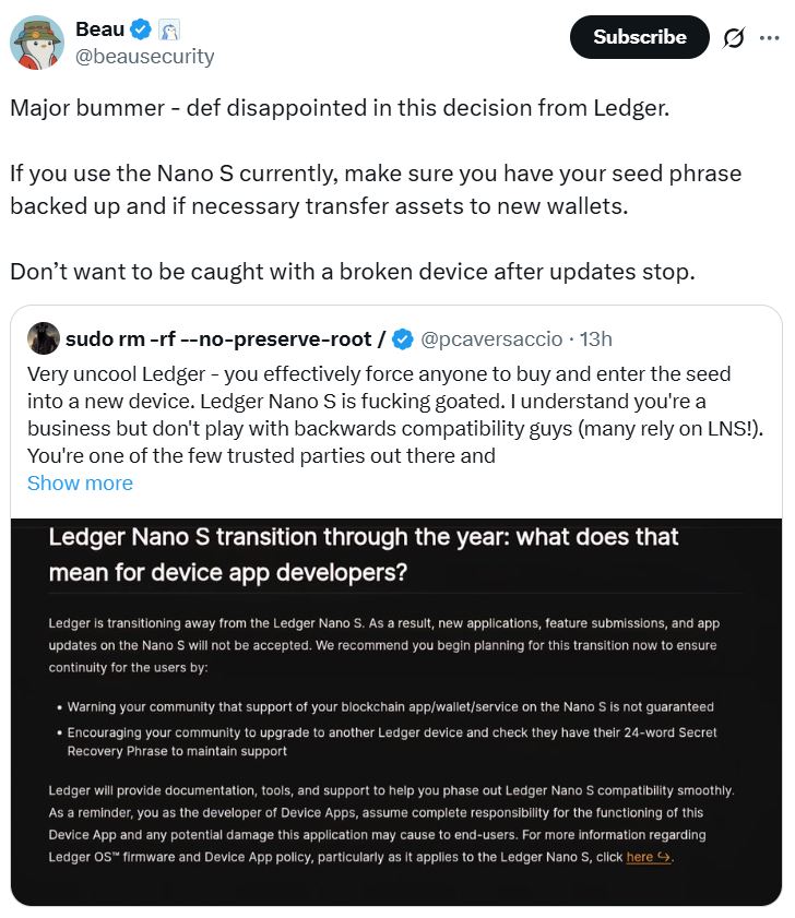 “If you use the Nano S currently, make sure you have your seed phrase backed up and if necessary transfer assets to new wallets. Don’t want to be caught with a broken device after updates stop,” Beau said.