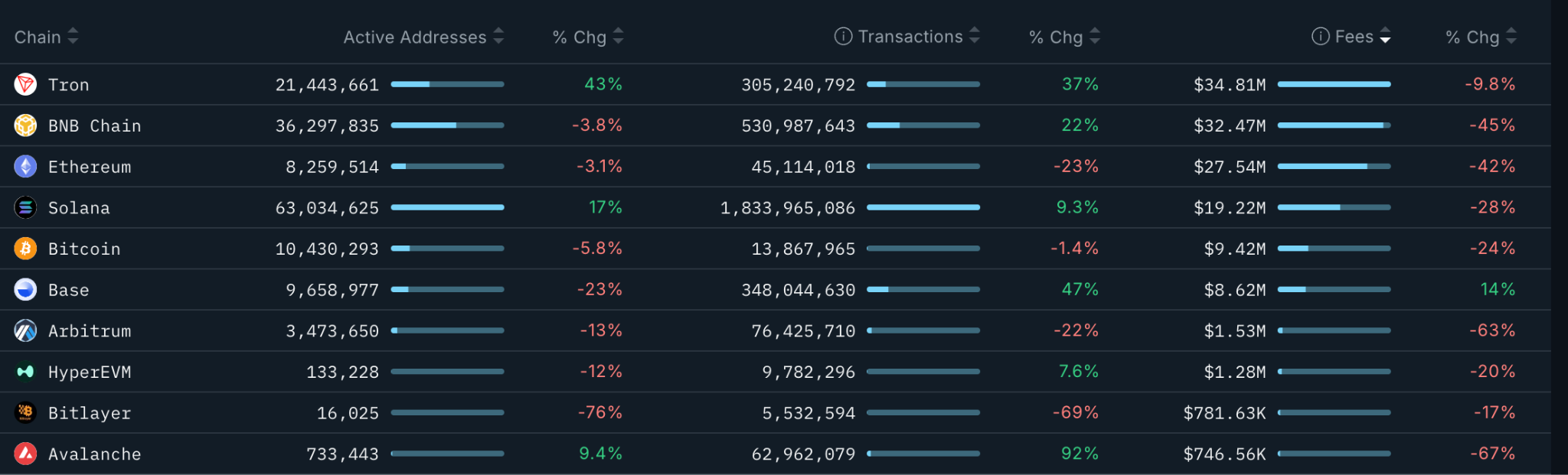 Ethereum’s fees over the past 30 days dropped to $27.54 million on Friday, representing a 42% decrease. Solana’s fees declined just 9.8% while BNB Chain revenue dropped by 45%, reinforcing the bearishness in the market.