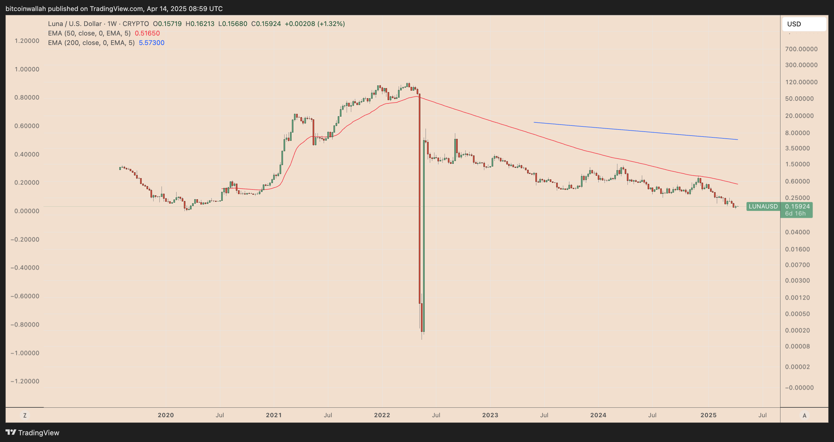 This setup strongly mirrors LUNA’s post-crash behavior. After its sharp decline in May 2022, the price staged a brief recovery but failed to reclaim its 50-week and 200-week moving averages, triggering a deeper and more prolonged downtrend.
