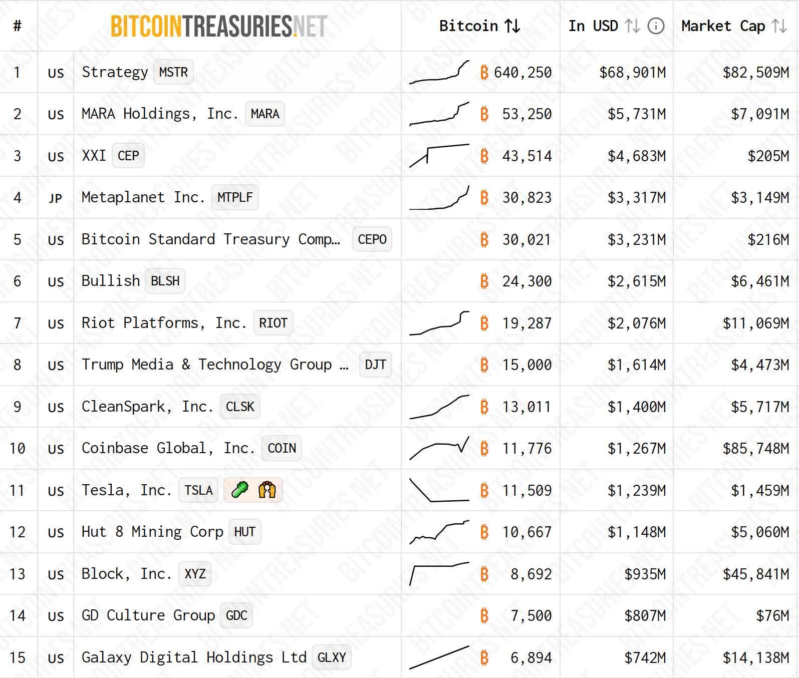 In second place is MARA Holdings (Marathon Digital) with 53,250 BTC worth approximately $5.7 billion, followed by XXI (CEP) in third with 43,514 BTC valued at $4.7 billion. Japan’s Metaplanet (MTPLF) ranks fourth with 30,823 BTC, while the Bitcoin Standard Treasury Company (CEPO) rounds out the top five at 30,021 BTC.