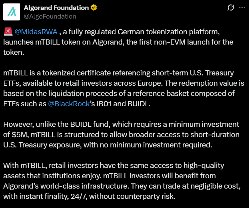 The Algorand Foundation commented on the mTBILL launch, saying, “These assets will make their way to our DeFi ecosystem in the coming weeks.”