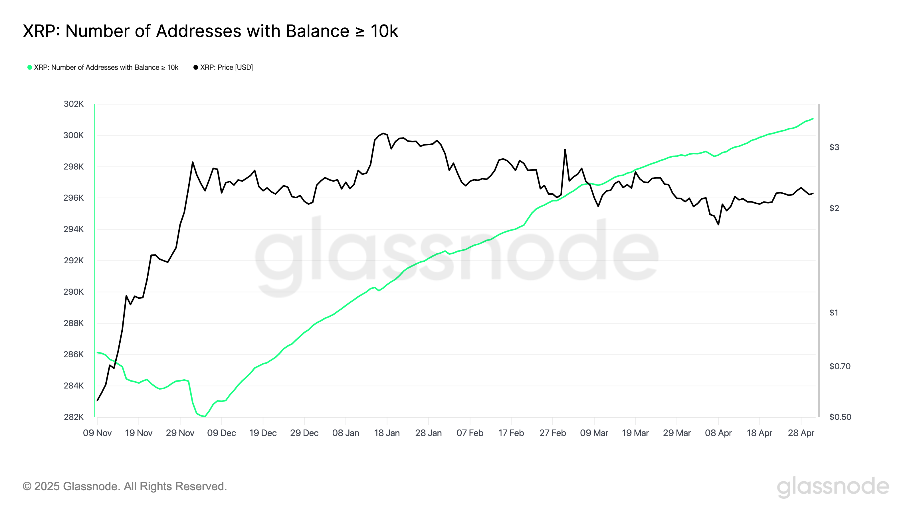 Further reinforcing the case for real demand, Glassnode data shows a consistent rise in the number of XRP addresses holding at least 10,000 XRP (the green wave in the chart below) since late November 2024.